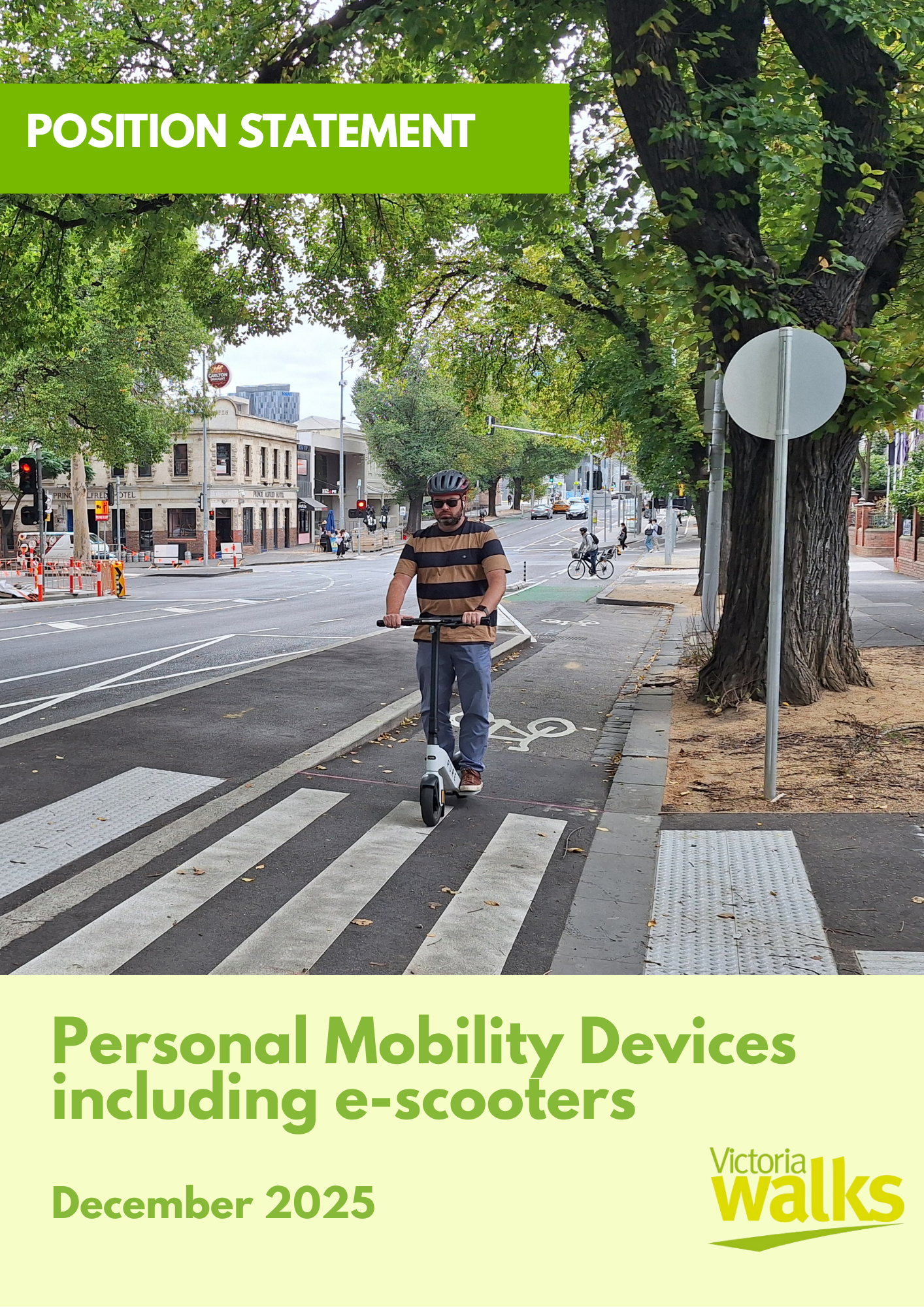 Victoria Walks is committed to creating walkable, safe and inclusive public spaces. Our position on PMDs prioritises the safety of pedestrians, the accessibility of footpaths for all users, and evidence-based policy approaches that support sustainable and equitable mobility. We draw on road safety principles and community concerns about the impacts of higher-speed devices in pedestrian spaces, and advocate for regulatory frameworks that protect walkers while addressing emerging transport technologies